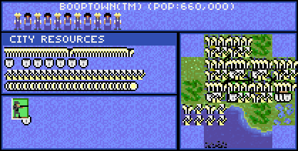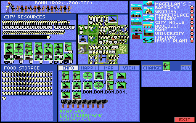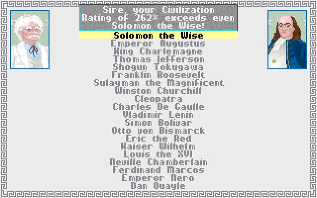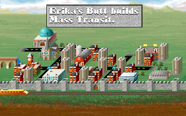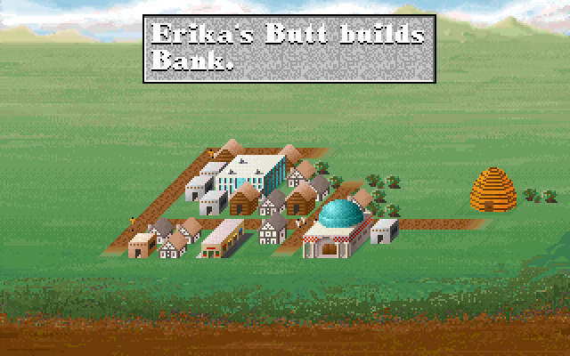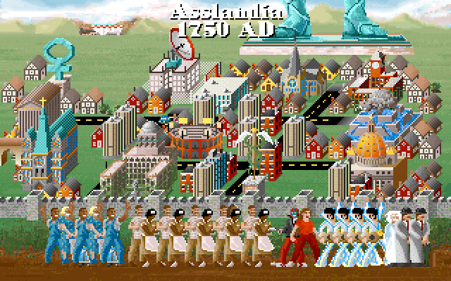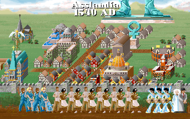 Spread out in front of the city gates, you can see a representative sample of Asslandia's population from 1540. It's comforting to see that instead of blacksmiths and homemakers, the middle class was comprised of waitresses and newspaper editors. The upper class was apparently going through a disco phase. And of course the entertainers were all Elvis. In the lower right you can see my bonus scientist who looked like Albert Einstein, and my bonus tax collector who resembled Peter Sellers.