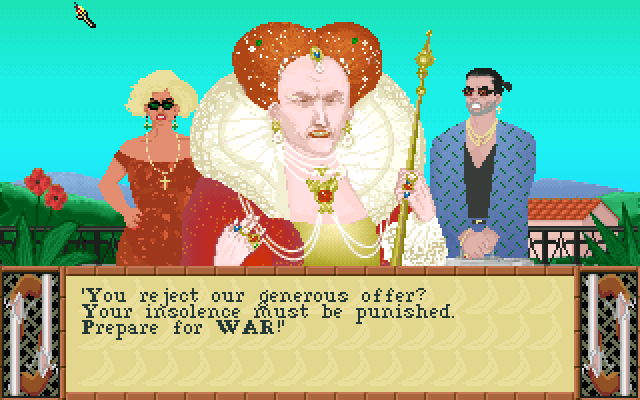My first encounter was with the English. From the company she keeps it's clear that the Queen is running a banana republic. Just look at those evil representatives flanking her. And check out that angry scowl, it really is unbecoming. Just recently a fellow in the Civilization forums online compared her looks to "diarrhea in a tiara". Ooooo, harsh!!