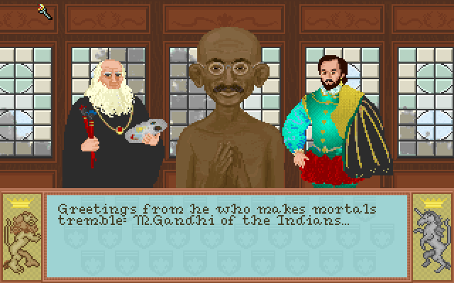 The dialogue was typical. Gandhi demanded a ridiculous sum of money in the name of peace, and I refused to pay, so he vowed to destroy me. I responded by sneaking a diplomat into his nearest city and causing a revolution, making the city mine. He immediately roped me into another audience, and used it to demand even more money this time, which of course I refused to pay. Then I stole another of his cities out from under him. This went on for decades.