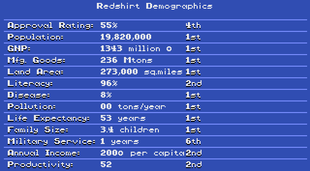 Time for some demographics. The most amusing statistic I find in this set is my approval rating, which is 4th in the world and only about 50%. This, despite unprecedented growth and prosperity, absolutely no civilian casualties from military action, and a literacy rate of 96%. I have no idea what it takes to make these people happy.