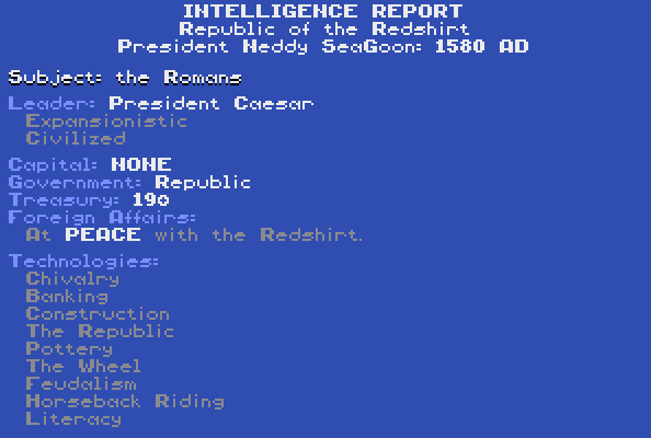 Poor Caesar was in a terrible situation. He had no capital city, since it was conquered by the Indians and then stolen by me. His government was a republic but his city was in a constant state of anarchy so he couldn't produce anything - not even a single covered wagon that he might use to improve his land. It would have immediately starved to death. His only foreign contact was with me, and his level of technology was, frankly, pathetic. He had no chance.