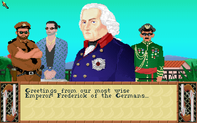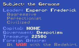 I made landfall on the huge continent and immediately plunged into an audience with Frederick, the German Emperor. Like all the others, he demanded tribute to avoid armed conflict, which in his case was redundant since he'd been trying to invade my land for the last 1000 years. He was running a banana republic just like the English, which made sense because after all, he was a dirty cheater and didn't have to worry about his income level like I did. His advisors looked even uglier and meaner than the ones attending to the Queen.