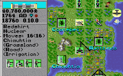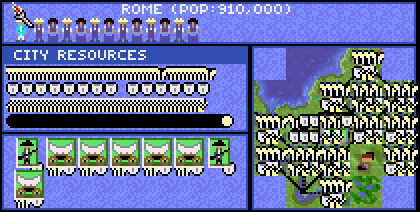 For the next fifteen years, the game had a nervous breakdown and spewed black squares of pollution all over the landscape, mostly on arctic tundra and mountainsides where my settlers had not laid roads. I yanked everyone off work and made them all tax-men, and built recycling centers in every single city, but the pollution still came. Even the Romans, who would be hard pressed to manufacture so much as a fresh turd, somehow got fouled by pollution.