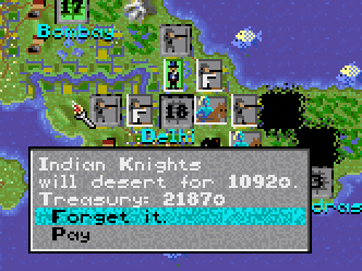 At this point, the majority of the world was trading fire with riflemen and tanks. Knights on horseback were a sad anachronism. They're practically worthless. Yet here was a troop of them demanding half my treasury in compensation for defecting. Why? Well... Perhaps because they were surrounded by their fellow countrymen, and standing at the gates of their own capital city. I bet Gandhi himself was leaning out from a tower window and making threatening gestures at them.