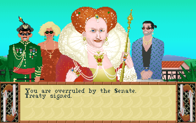 The Queen smuggled herself into an embassy and presented my senate with a cease-fire agreement, clearly stalling for time so her diplomats could plunder the blueprints for mechanized infantry and dig themselves in like lice.