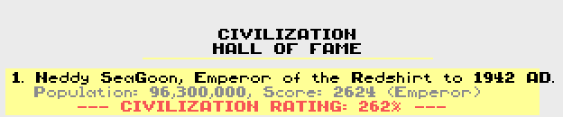 Even without my foreign acquisitions, my empire would have still had a very high rating because of its exponential growth at home. Here in the city of BoopTown(tm), half of all the food produced every year was surplus and went towards feeding new populace. This created an incredible growth rate. In fact, for about 3000 years the average family size of my empire was five children. That's a whole lot of dirty diapers.
