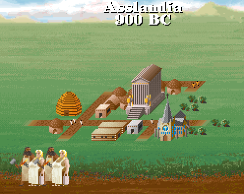 Here's beautiful downtown Asslandia, circa 900 BC. My peasants were living in baked adobe huts, and spending most of the time working iron and being pregnant (if the picture is to be believed), and yet they had managed to construct a majestic stone cathedral, and the Great Library across the street. The literacy rate of my entire civilization was around 5% at this time, but that didn't stop the Great Library from winning me many new technologies every couple of turns. It's best not to think about these inconsistencies - or for a certain kind of mind - like mine - it may be fun to think about them incessantly, because they're all over this game and they're fun to pick at, like lint balls on a holiday sweater.