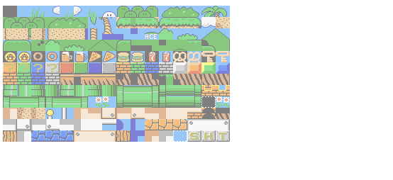 This is the World 1 blockset, drawn in Deluxepaint or some other program made of sheepskins and twine. The highlighted chunk in the animation is used for drawing vertical pipes. Pipes are slightly skinnier than the two blocks they occupy on screen, so we need versions with a fringe of blue sky and versions with a fringe of green grass to mesh with the blocks around them. Here's what we did: