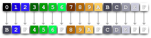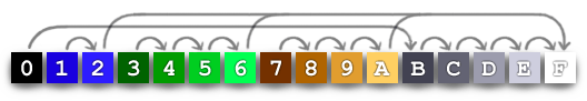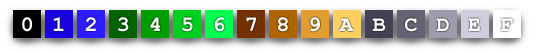 An even cheaper way to convey the illusion of "fog" is to swap dark colors on a source image for light colors, to create fingers of mist like in the screenshot above. This isn't real transparency because the colors always brighten instead of averaging, but it's easier to apply and allows for easier re-use of colors. For example, in the Gothic Land palette, we replace color 1 with color 2, turning blue into lighter blue. We replace color 0 with color B, turning black into the darkest available grey. The "foggy" version of all the lightest colors ends up being white, hence colors 2, 6, and A all turn into F. We picked a similar transition for every color in the palette: