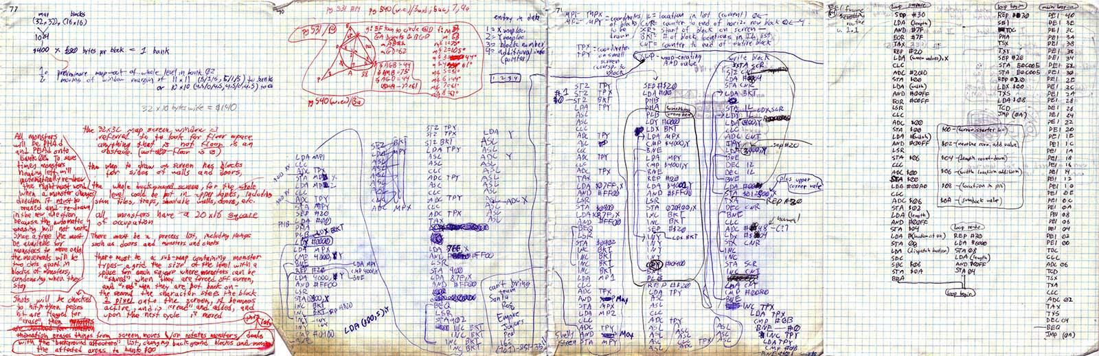 Desktop computers have changed so much that you might wonder: Why did we write so much code just to lower redundancy in a 32k blockset? Wouldn't the size of the code cancel out the savings in data? It probably would have, if we wrote it in C++ and had all the variables padded out to 32 bits. But in Assembly Language, all the logic to draw the blocks via the table, including an unwound loop for added speed, took less than 100 bytes of space.