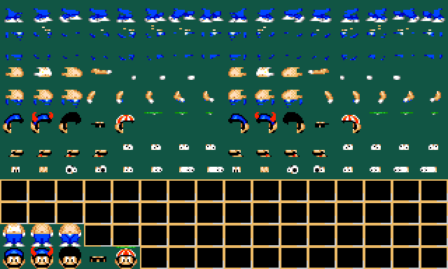 If you divide the set down the middle, you come up with two regions of sprites that are mirror images. The region on the left is used when Guido is facing right, and vice-versa. The handful of sprites at the bottom is for use when Guido is facing forward, which only happens when he goes down a pipe or through a door.
