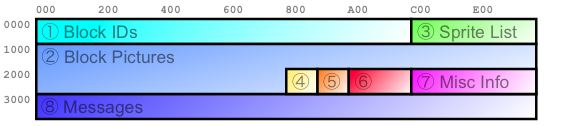 Here, finally, we come to the section that's full of messages for message blocks. The only thing to add here is that we should have stored these by putting them in a linked list, but instead we used extra entries in Section 4 to point to them. Instead of a door, the X and Y coordinates pointed to a message block - hidden or otherwise - and instead of a destination, those X and Y coordinates were combined into an address that pointed to a message.