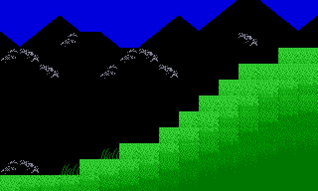 We'd set a hard limit of 30k for the block data in a given World, and as long as we didn't go over that limit, we could fit all the block data on one screen and edit it all at once, which was hugely convenient. Using the tables of pointers, we could also define many redundant blocks without a high memory cost. Like ten blocks of green grass, for example, each defined at a slightly different offset in the column, making grass grow at ten different heights on the map. We used this effect in Gothic Land to smooth out the interior of the rolling hills in Area 1: