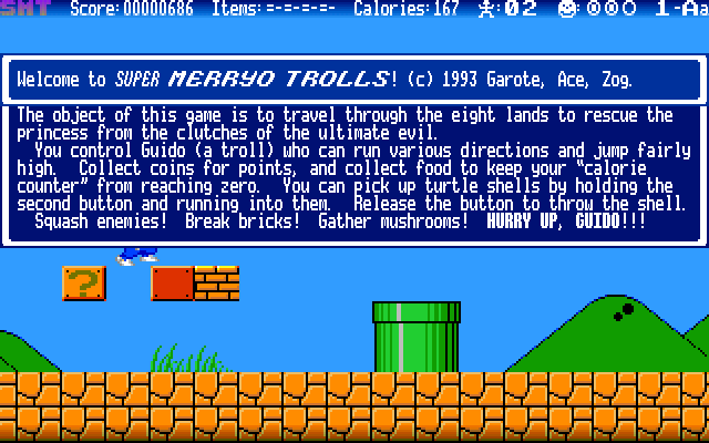 _1Welcome to _4SUPER _8MERRYO TROLLS!_1 (c) 1993 Garote, Ace, Zog.