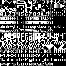 To draw text you need a font, and we rolled our own font as well, the same way we created the blocksets. Each block was 8x16 pixels, and we drew a lot of them like puzzle-pieces to combine and make larger characters, like the two-block italic typeface shown above, and a three-block "extra large" typeface. The font data was small, and we wanted it to be in memory all the time, so after we drew it we ran it through a BASIC program that turned it into Assembly Language source code, as big chunks of predefined arrays. We stuck that code in a file called "FONT.S" and included it when we compiled the game.