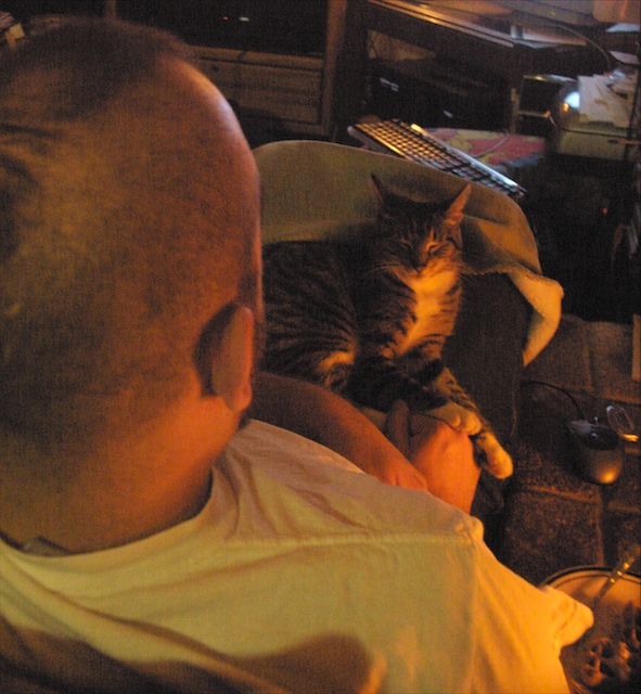 We lived in a two-story house. Everyone slept upstairs in a couple of bedrooms except for me, down on the first floor in my own room. After that night I would very often wake up, at 2:00 or 3:00 in the morning, with the image of a cat writhing in pain echoing in my head, or of myself as the cat. I would stumble out of bed in the dark and creep into the downstairs living room. Sometimes a cat would be there - Fred or Sasha - and I would pet it and try to reassure myself that it was safe, and I was safe. Sometimes I would imagine an insane man rising up from behind the furniture, or stepping out from the shadows. His eyes were wide and he was grinning like a skeleton, and he had a glowing green syringe raised in one hand, ready to stab me.