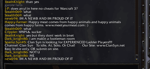 To keep myself amused while scanning for a game to start, I've taken to joining a Battle.net chat room at random. It's just like the IRC of old - freaks and morons, all shouting at once in 1337sp34k. You can identify the Macintosh players because they use the ALT-symbols more freely in their 1337. This dull roar is punctuated by guild announcements from bots - pasting the same message into the chat room over and over again, pleading for residents to come join channel so-and-so to be part of guild such-and-such.