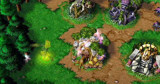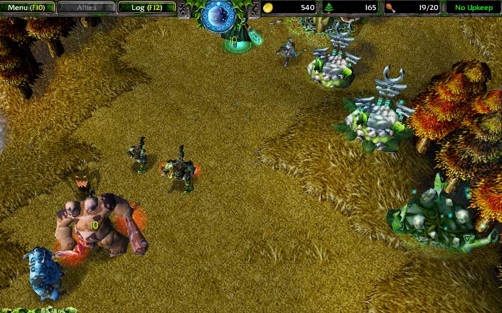 On that subject, I really need to do something about the Orcs. I've withstood Human, Undead, and even fellow Night Elf armies, though I suspect the Human armies in question were very badly managed. I never beat the Orc armies though. Bloodlusted Tauren under the influence of Spirit Link just cannot be overcome by a complementary Night Elf melee force, and they are always followed up with Batriders, which explode and kick the shit out of any air force I respond with. If I mix it up by producing Chimaera along with my Bears and Giants, I have no way of stopping the Batriders. If I shift Bears and Giants to Chimaera and keep the Archers, the Tauren stomp over and chew the Archers up, along with my Heros. And of course, Wolf Riders throw nets all over the Chimaera anyway.
