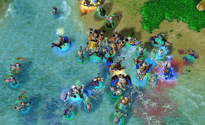 Command-queueing worked much better when I tried it with the ranged units - shift-clicking on sequential targets made a little flag icon appear over each one, and as soon as the first one fell, they all changed their focus very handily. In a FFA game it was tough to keep track of what to target, but in a series of 1v1 games it gave me a serious combat advantage, since I was able to group-target with my ranged units and control my hero at the same time, instead of trading off.