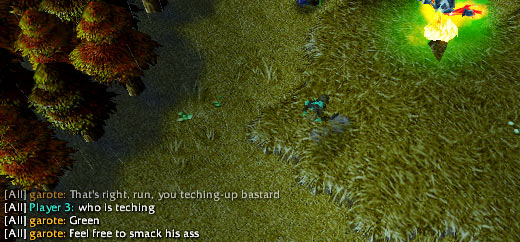 One player used the common tactic of making a pile of orc bat-riders, and then going from base to base destroying only the central buildings, seriously handicapping his competitors. Another player replied, "I used to see that tactic a lot when I played a year ago. Then I left this game for World of Warcraft, and all my skills went down the drain."